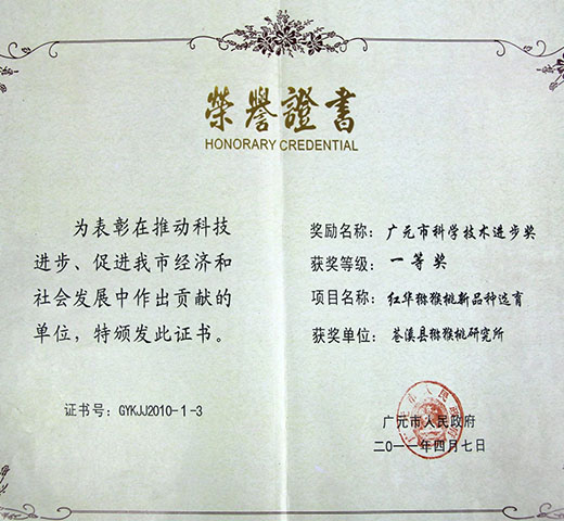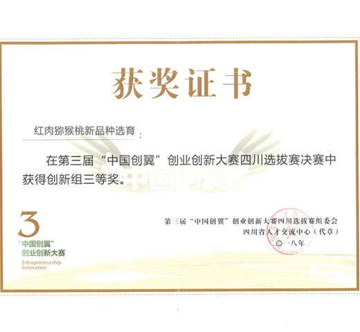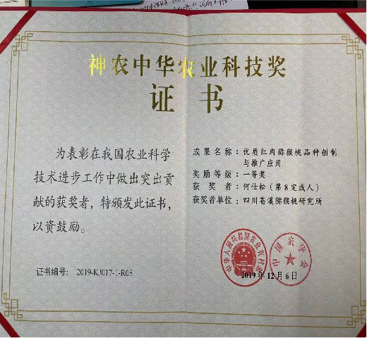 4、2019年《优质红肉猕猴桃品种创制与推广应用》获国家级神农中华农业科技奖一等奖、《猕猴桃资源收集、保存、育种和产业化技术研究》获四川省科学技术奖励一等奖。