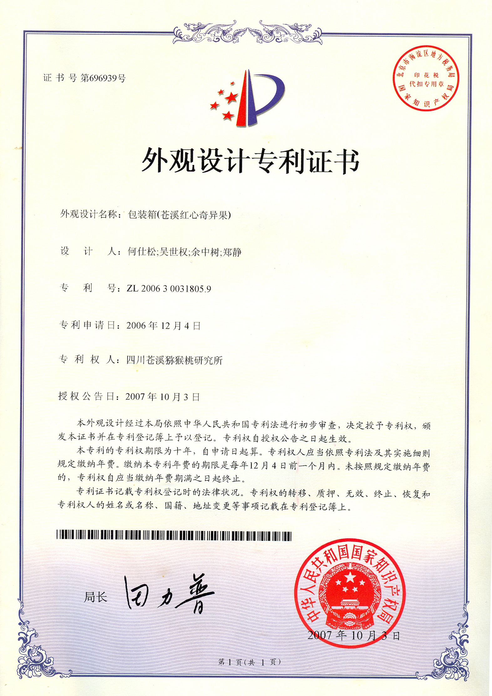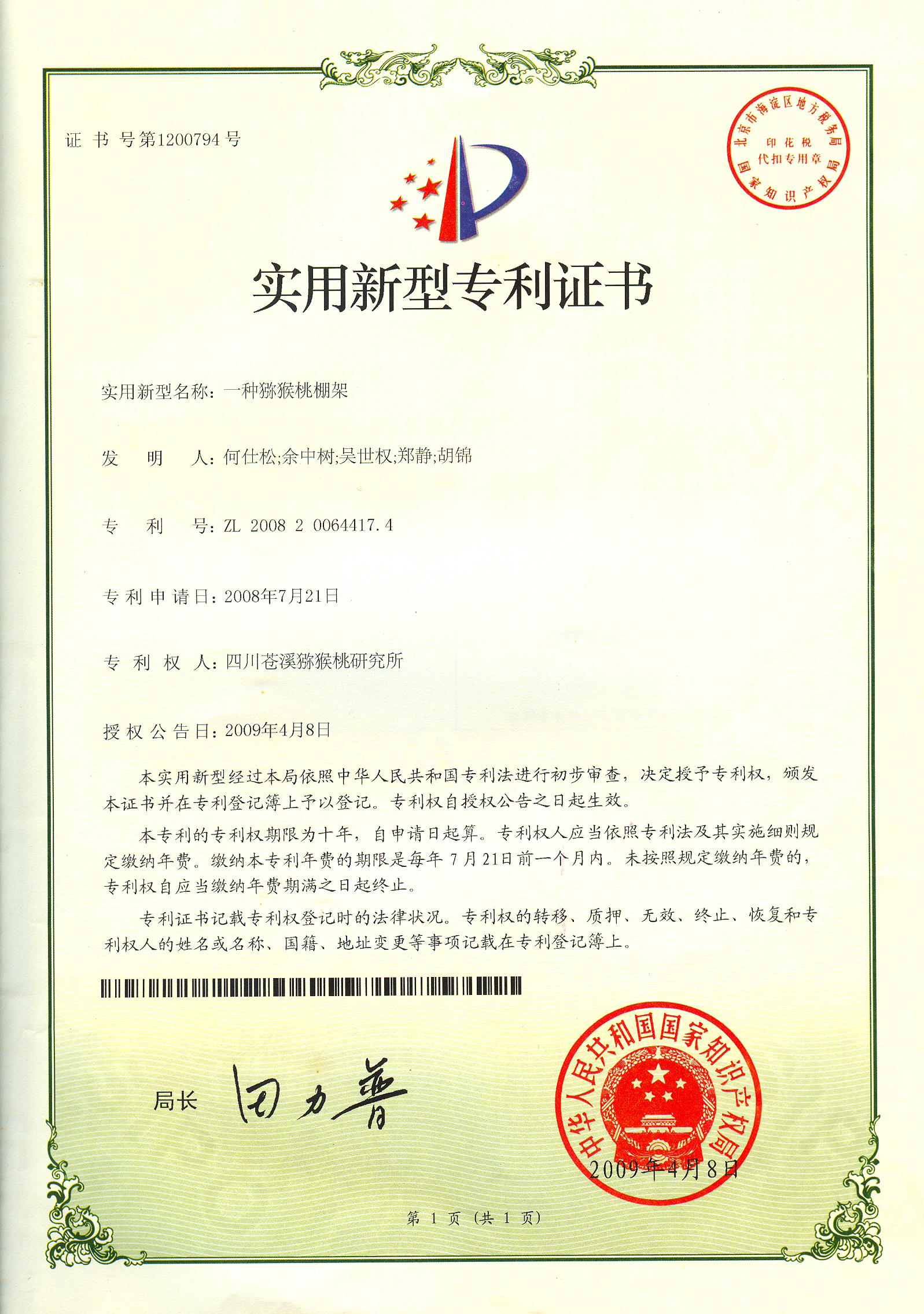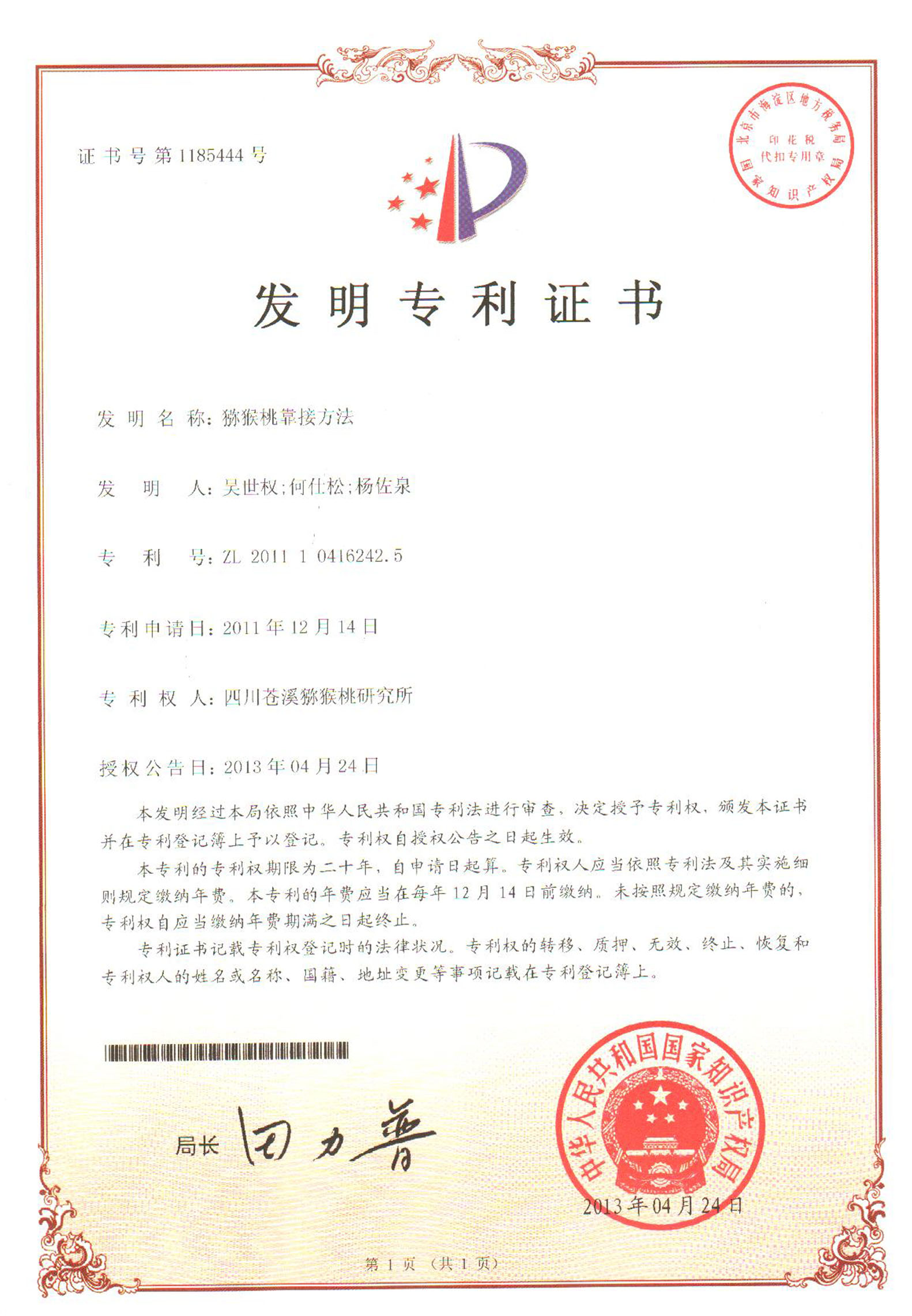 1、取得专利累计获得专利6个,其中发明2个、实用新型1个、外观设计3个。近年来主要获得的专利有:一种猕猴桃抗溃疡病双向脱毒大苗生产方法、猕猴桃靠接方法、防治猕猴桃溃疡病的方法等。