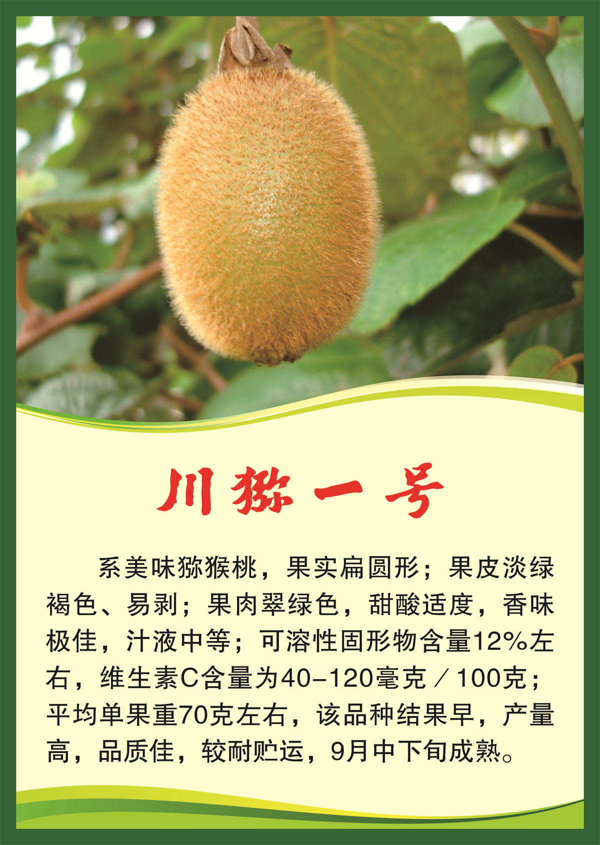 系美味猕猴桃,果实扁圆形;果皮淡绿褐色、易剥;果肉翠绿色,甜酸适度,香味极佳,汁液中等;可溶性固形物含量12%左右,维生素C含量为40-120毫克/100克;平均单果重70克左右,该品种结果早,产量高,品质佳,较耐贮运,9月中下旬成熟。