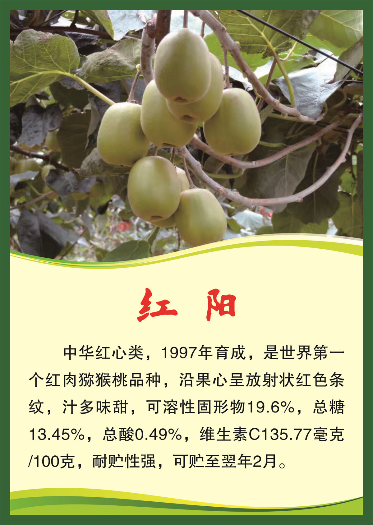 中华红心类,1997年育成,是世界第一个红肉猕猴桃品种,沿果心呈放射状红色条纹,汁多味甜,可溶性固形物19.6%,总糖