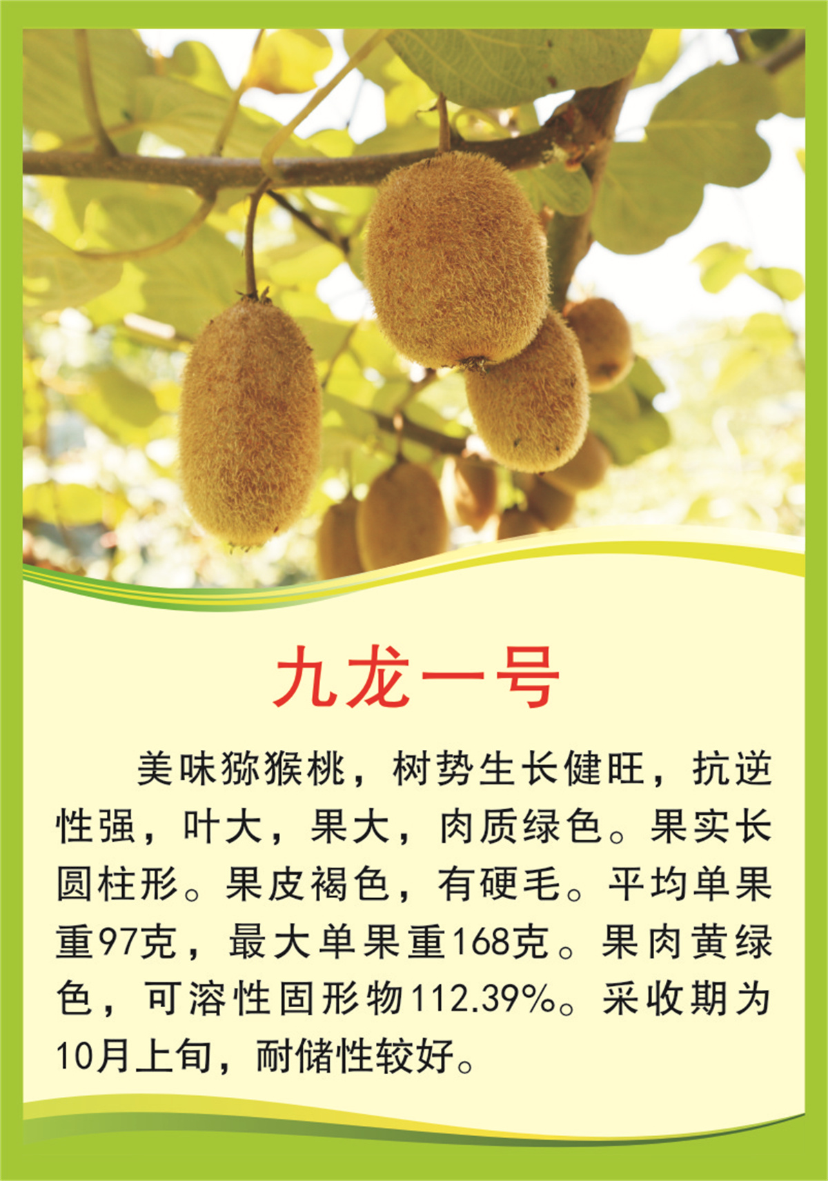美味猕猴桃,树势生长健旺,抗逆性强,叶大,果大,肉质绿色。果实长圆柱形。果皮褐色,有硬毛。平均单果重97克,最大单果重168克。果肉黄绿色,可溶性固形物112.39%。采收期为10月上旬,耐储性较好。